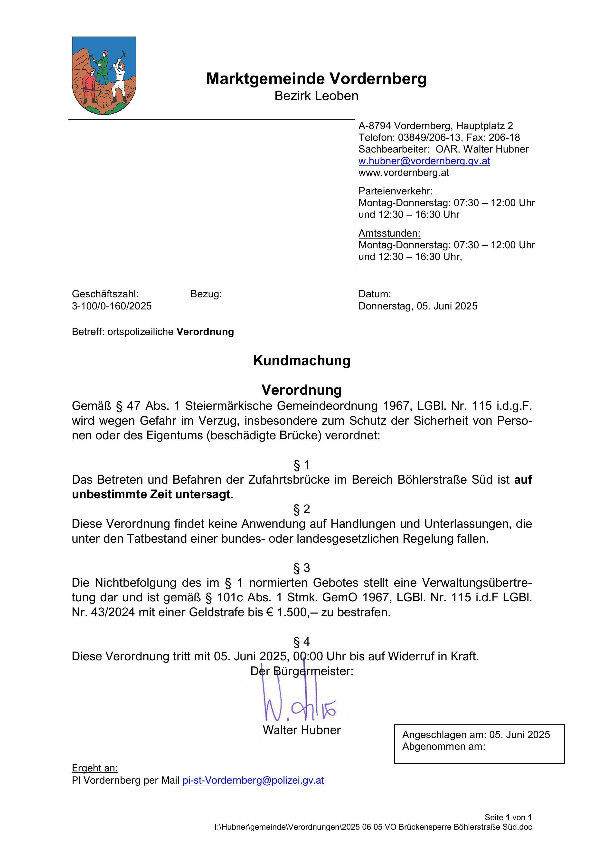 Sperre Zufahrtsbrücke Böhlerstraße SÜD wegen Gefahr im Verzug bis auf Widerruf!