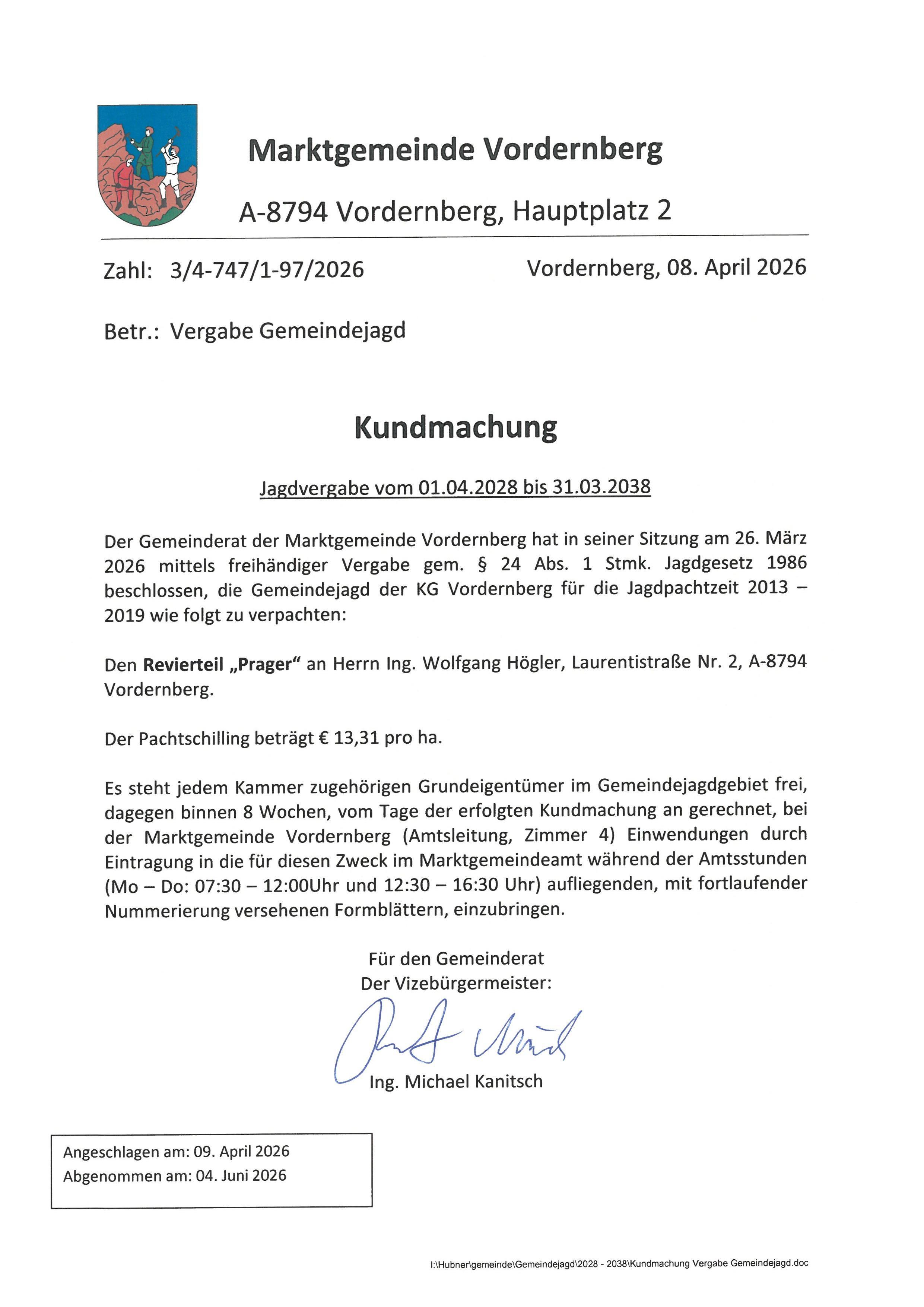 Jagdvergabe vom 01.04.2028 bis 31.03.2038