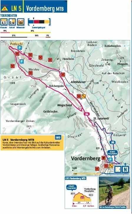 Der Ausgangspunkt dieser Tour ist am Hauptplatz Vordernberg, nahe dem Radwerk IV. Zuerst folgt ein steiler Anstieg Richtung Hohe Rötz, ehe es nach rund 1500 m links Richtung Fernsehsender mit geländeähnlicher Abfahrt abgeht. Von hier bekommt man prächtige Ausblicke auf die umliegende Bergwelt und der Präbichl-Passstraße. Nach erneutem Anstieg zur Laurentikirche führt der Weg zurück auf der Eisenbundesstraße B115 durch den Markt Vorderberg mit seinen zahlreichen montanhistorischen Denkmälern.