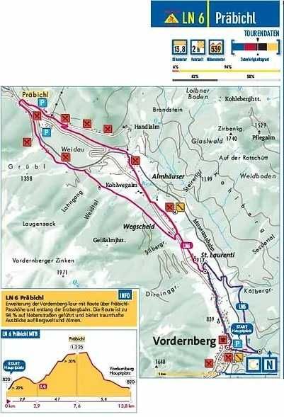 Der Ausgangspunkt dieser Tour ist am Hauptplatz Vordernberg nahe dem Radwerk IV. Zuerst folgt ein steiler Anstieg Richtung Hohe Rötz, ehe es nach rund 1500 m links Richtung Fernsehsender mit geländeähnlicher Abfahrt abgeht. Von hier bekommt man prächtige Ausblicke auf die umliegende Bergwelt und den Präbichl. Nach dem Anstieg zur Laurentikirche überquert man die Präbichl-Bundesstraße und fährt stetig ansteigend über Wegscheid zur Kohlbergalm. Entlang der Erzbergbahn quert man die Pisten des Skigebietes Präbichl-Grübl, bevor man die Präbichl-Passhöhe erreicht, wo man die Möglichkeit zur Rast samt Ausblick auf den Steirischen Erzberg und die Windenergieanlage auf dem “Lauf” hat. Auf der alten Laufstraße des Erzwanderweges und der ehemaligen Bundesstraße (heute Rodelbahn) geht es zurück Richtung Vordernberg und bei den “Almhäusern” führt die Route zurück auf der Eisenbundesstraße B115 durch den Markt Vordernberg mit seinen zahlreichen montanhistorischen Denkmälern.